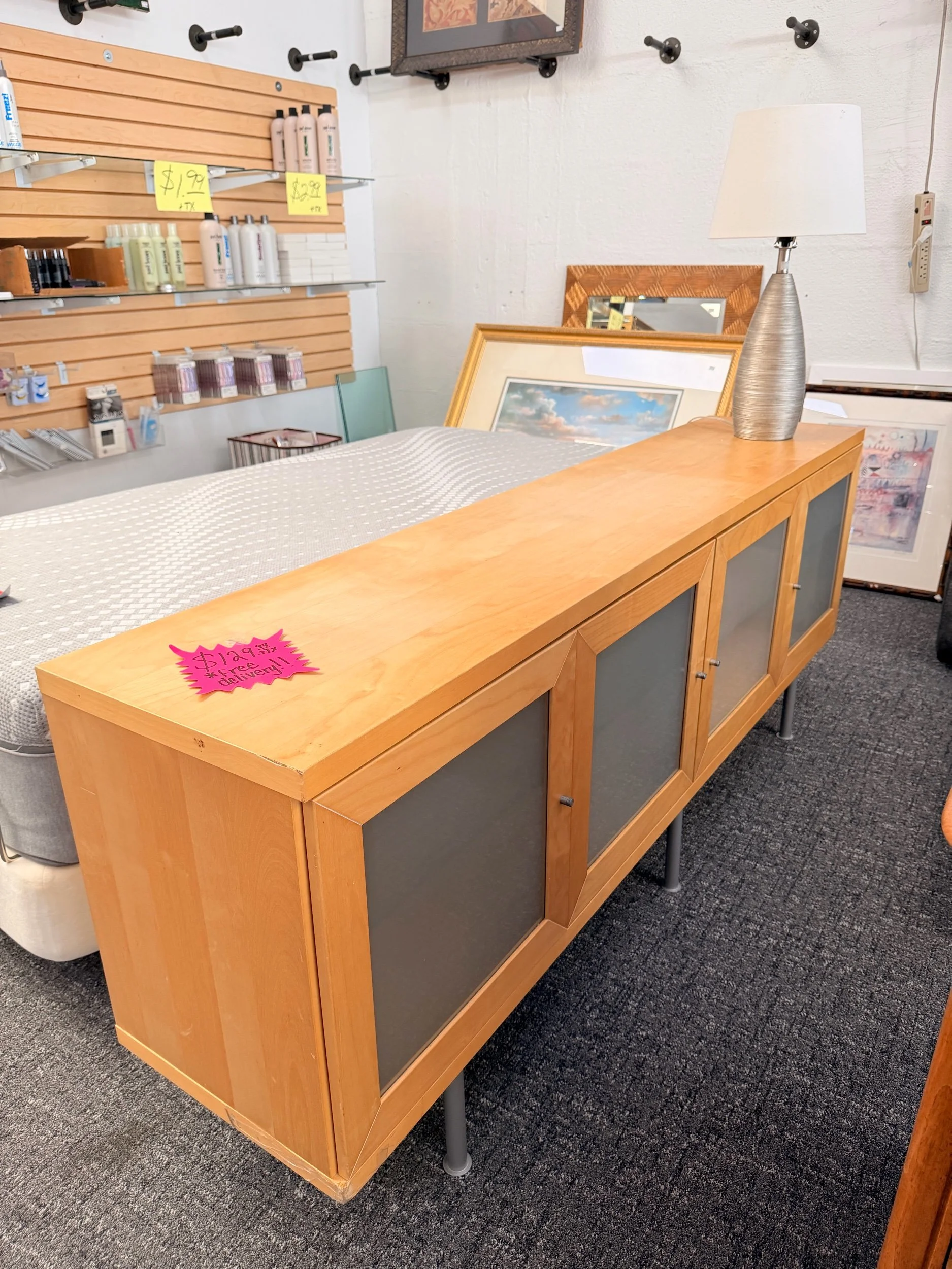 Beautiful modern wood sideboard / media console with frosted glass cabinet doors — clean, minimalist look with tons of storage.
