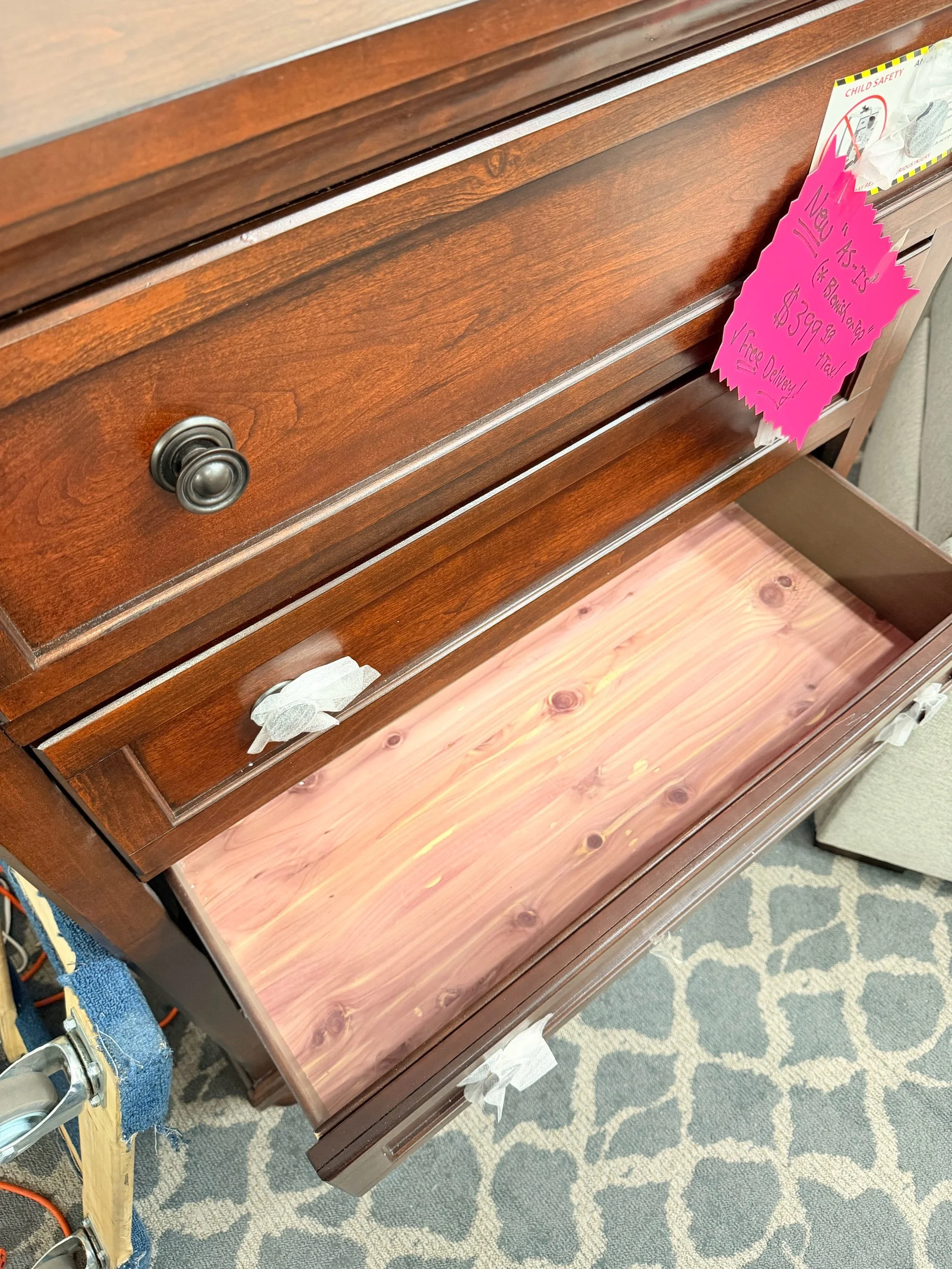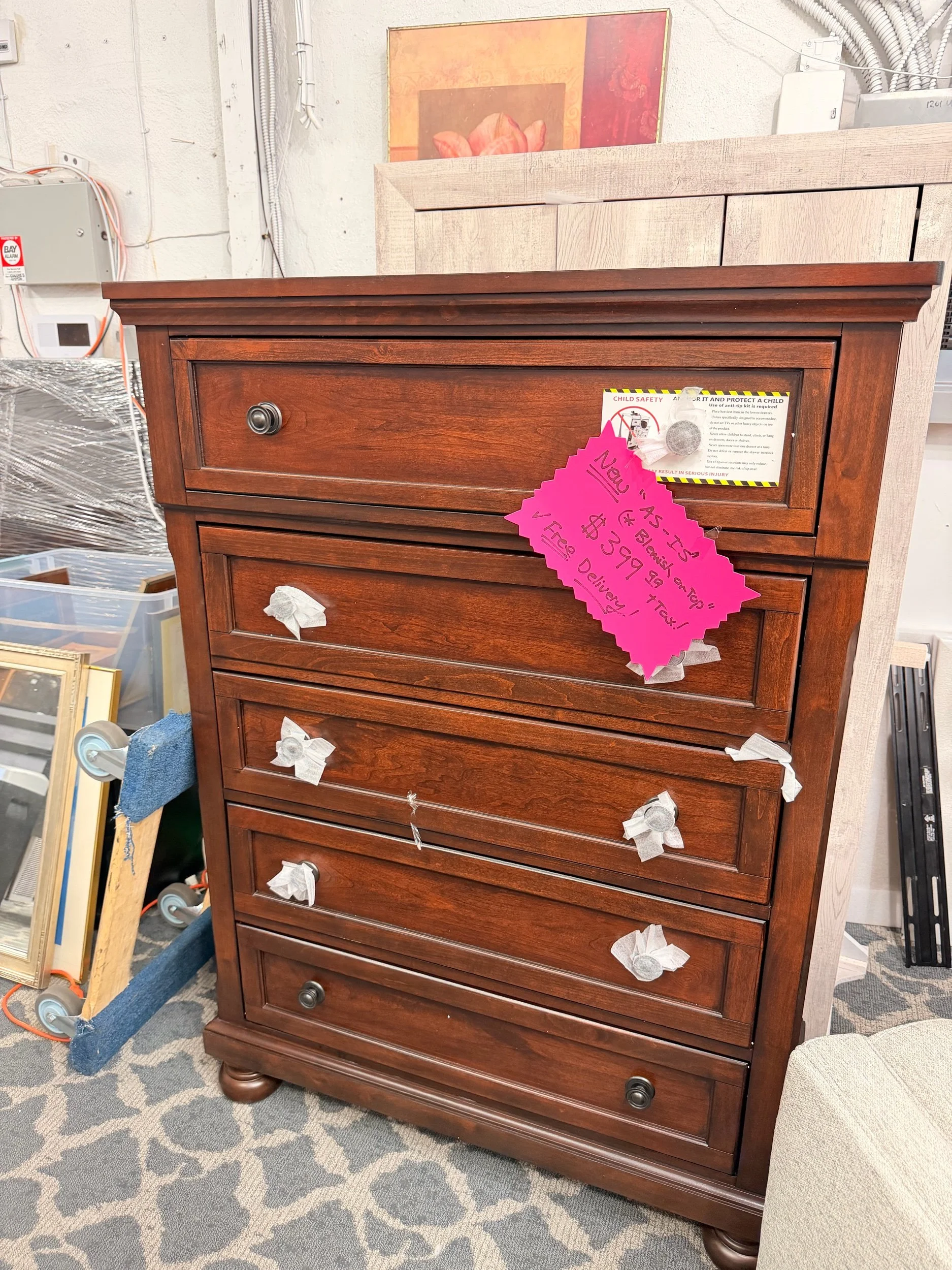 Clean, sturdy dresser with a beautiful rich brown wood finish. Perfect for any bedroom setup.